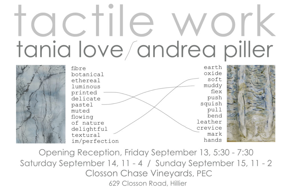 Presented within the unique Closson Chase Vineyards barn in conjunction with Chetwyn Farm, the exhibition tactile work will engage the senses with textural ceramic works by Andrea PIller and flowing naturally dyed textiles by Tania Love.