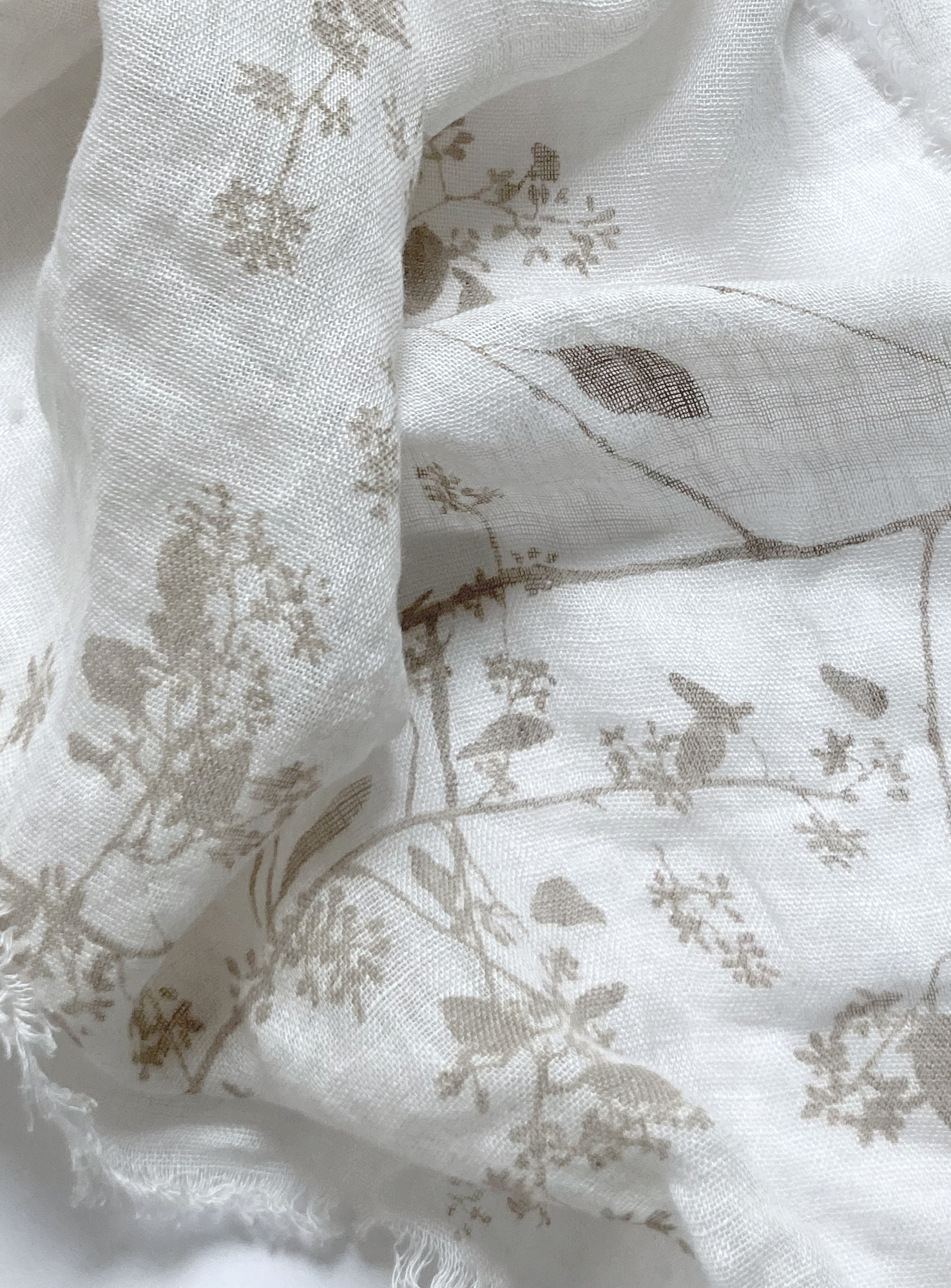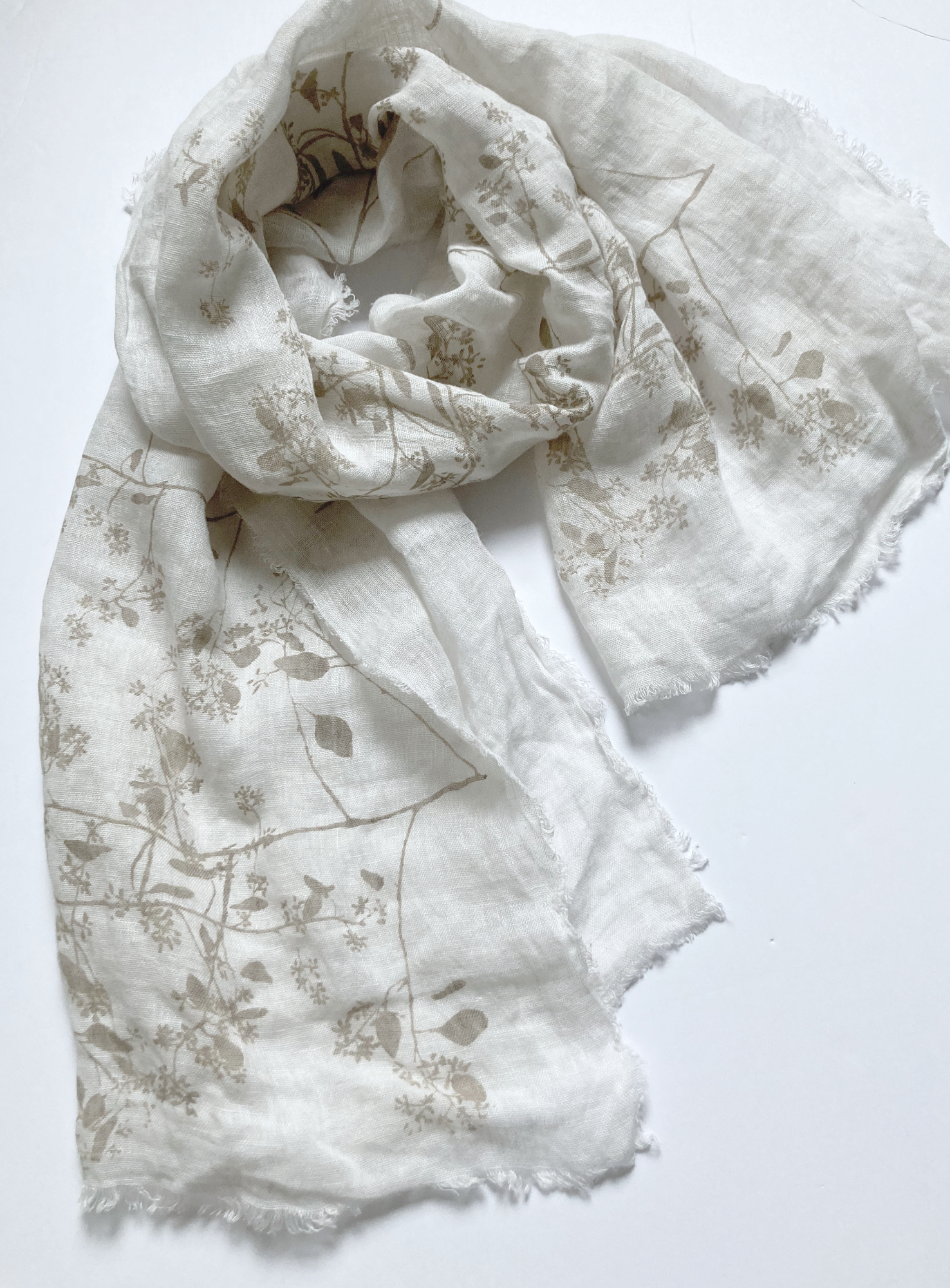 Light weight Polish linen gauze, hand screen printed with my eucalyptus drawing using black walnut ink.